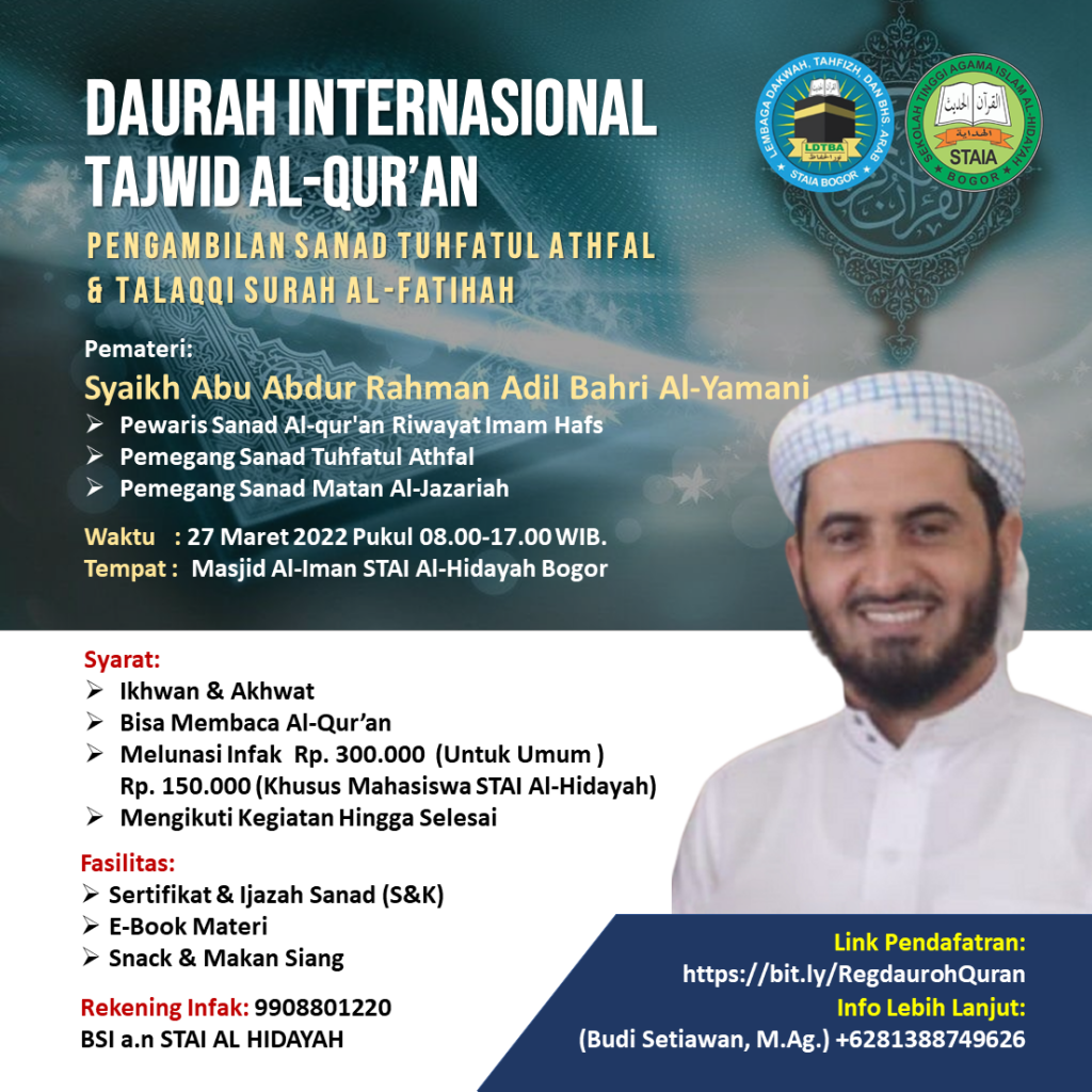 DAURAH AL-QUR’AN BERSANAD INTERNASIONAL DAURAH INTERNASIONAL TAJWID AL-QUR’AN PENGAMBILAN SANAD TUHFATUL ATHFAL & TALAQQI SURAH AL-FATIHAH Form Pendaftaran DaurohNama Lengkap *Pilih *UmumMahasiswa STAI Al-Hidayah BogorAlamat/Kota *Email Apakah anda hafal matan tuhfatul athfal? *YaTidakUpload Bukti Transfer Uang Pendaftaran * Verificationinput dua Digit angka *contoh: 12This box is for spam protection – <strong>please leave it blank</strong>: