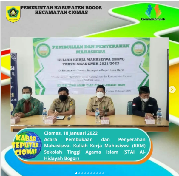 Acara Pembukaan dan Penyerahan Mahasiswa. Kuliah Kerja Mahasiswa (KKM) Sekolah Tinggi Agama Islam (STAI Al-Hidayah Bogor) di Aula Kecamatan Ciomas yang dihadiri langsung oleh Camat Ciomas Bapak Drs. Chairuka Judhyanto, M.Si dan Sekretaris Kecamatan Ciomas Bapak Saeful Jack Peter, S.Sos., MM.