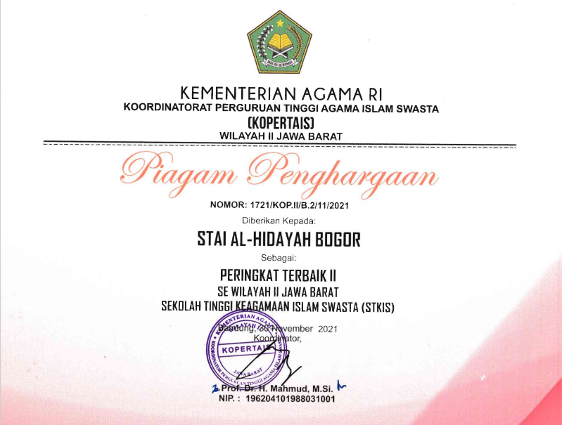 “Terima kasih jazakumullah khoiran kepada civitas akademika Al-Hidayah atas komitmen yang diberikan, sehingga Al-Hidayah menjadi Sekolah Tinggi terbaik ke-2 se-Jawa Barat dan pringkat terbaik ke-1 jurnal terakreditasi terbanyak PTKIS-KOPERTAIS Wilayah II Jawa Barat.”